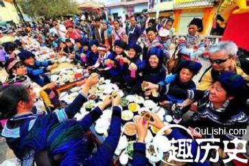 各家各户将烹制好的各种美味佳肴用小簸箕端到街心,顺序摆在长长的蔑垫上,全寨人同饮共食,通街宴长达百十米,场面极为壮观。