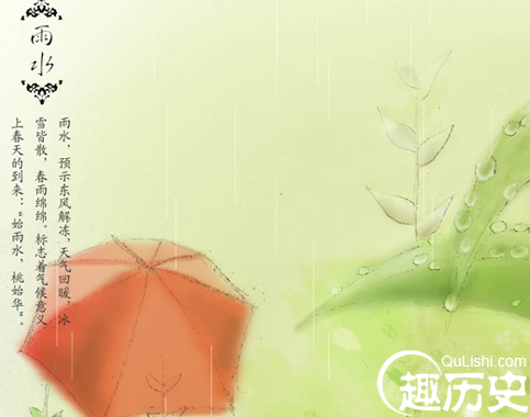 雨水,表示降水开始,雨量逐步增多。雨水,表示两层意思,一是天气回暖,降水量逐渐增多了,二是在降水形式上,雪渐少了,雨渐多了。雨水后,春风送暖,人们明显感到春回大地,春暖花开和春满人间。