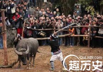 舅爷砍牛。过去,居住在黔桂交界的瑶族,崇拜祖先,重丧祭。有老人死亡,往往要舅爷砍牛祭供。分不同的姓氏,杀水牛或黄牛。先由几个年轻人执鞭撵牛绕场两圈,边撵边哭,接着,孝子低头背铧口进场,驾牛作犁田状,并用青草喂牛,用篾圈套住牛颈,再用粗绳把牛拴在木桩上。舅爷扛着大砍刀阔步闯入,趁牛不注意,猛朝牛颈砍下,众人立即一拥而上动刀剖解。