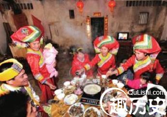 大年初一,青年小伙子抬着用纸糊的狗,走村串寨拜年。各户烧炮竹迎新。这是壮族古代崇拜狗的遗俗。