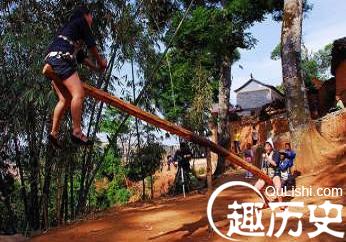 按照哈尼人的规矩,磨秋杆必须是黑夜砍好后,小伙子们在黎明前扛回来。他们一路唱着山歌,把用坚硬结实的木头做成的秋杆抬到寨边的秋场,将一根木头栽进土里,顶端削细当轴心,然后再把长长的横杆从中间凿凹,架在上面。两边的横杆长短要一样,还要削得滑溜溜的,以免划伤手。