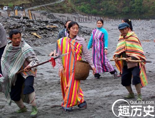 纺织技术传入独龙江的时间较晚,之前,独龙人常以兽皮御寒树叶遮羞。纺织技术传入独龙江后,纺织便成了独龙族妇女的主要劳作形式,她们常以麻皮、水麻皮、火草等野生植物为原料捻线织布,用野生植物为染料染线织出图案花纹,当地称独龙毯。独龙毯白天为衣晚上当被,穿着样式分场合而定,劳动、节日、喜庆、生活着装的样式各有不同,习惯穿法是,将独龙毯从左肩腋下斜拉至胸前,于右肩上方打结,袒露左肩右臂。