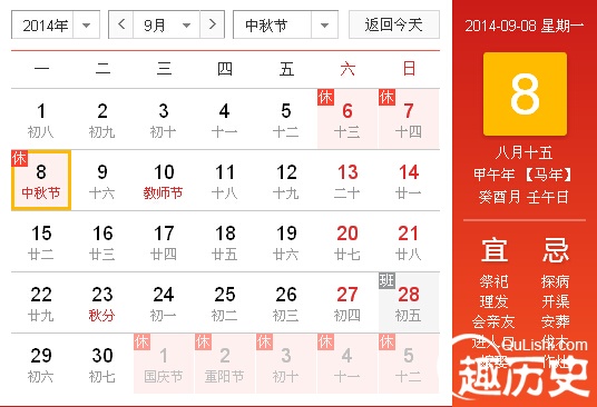 2014年中秋节是哪一天?2014年中秋节放假安排:9月8日放假,与周末连休。