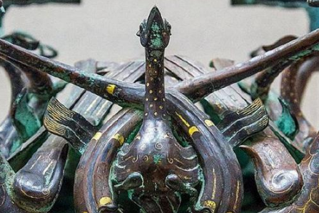 铜方案将古代青铜制造工艺的高超展现得淋漓尽致:底部是四只跪卧在地的梅花鹿,有两雄两雌,鹿头高昂,娇视前方;四条龙撑起整座案身,每条龙都用两条尾巴,嘴巴托起上拱,二尾向外缠绕反勾住龙头上的两角;四只凤聚集在中央形成半球形,凤头从龙的尾巴处引颈而出,呈现一副即将高飞之势。不得不说,鲜虞狄人的确富有创造性,这只案几突破了商周以来青铜动物的造型手法,完全以新式、独特的样貌惊艳人间。而且从中还可窥见古代"高科技",光铸造已经够繁琐了,但四龙四凤铜方案还采用了镶嵌、焊接等多种工艺,极尽复杂,精美绝伦,无以复加。