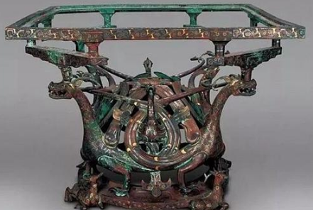四龙四凤铜方案,顾名思义就是铜质方形案几,类似于现代的高等茶几,但很可惜的是刚出土时,铜方案上的漆器木板早已腐烂,而仅剩下支撑部分的结构,而且坍塌下来的泥土已经把它压变了形,损坏比较严重。专家将这件残缺又被毁的文物迁移至工作室进行修复,但由于它制造原理太过复杂,所以修复人员足足观察了三天,才不得不动用钢锯将方案肢解,其后再利用焊接将其复原。经过数月的不懈努力,铜方案终于重获新生,足以惊艳世界,穿越数千年的魅力一下子就捕获了考古工作者的心。
