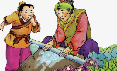 他一边闲游闲逛,一边东瞧西看。他看见一位老妈妈坐在磨刀石上的矮凳上,手里拿着一很粗大的铁棒子,在磨刀石上一下一下地磨着,神情专注,以至于李白在她跟前蹲下她都没有察觉。