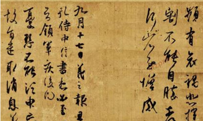 《孔侍中帖》六行,主要为行书,其中有的字规矩若楷,有些字纵肆如草,间集一起,却和谐一体,绝无格生之感。“九月”起始,扩大,“十七日”收敛,但以浓重而与前两字映衬和谐。“报”字用笔虽然粗重,但左敛右放,于起笔落笔之间交待清楚,笔姿揖让向背,结体敦实而又趋势若动,工而灵活。第二行最后两字“至不”之间距离似乎稍大,但整幅看来却又泯然不显,恐系为与第一行末字“固”相衬,故“不”字中竖极重而下长。第三行之“领”字,第一撇放之甚长且远,其他皆依附其侧,而精神振奋,皆赖此一笔之力。