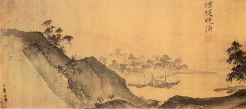 画作风格编辑南宋以画“边角之景”而著名的画家,马远、夏圭。边角景构的特点是,主体形象少,画面简洁洗练,留白面积较大,多用“计白当黑”的手法,有效的利用边角相互呼应,利用对角线保持平衡感,虚实对比强烈,它在提炼景物时,求劲求少,以很少的景物来衬托意境而不是直接用景物去“画”意境。在构图方面,夏圭更善于剪裁与美化自然景物,善画“边角之景”。对长卷画用概括的笔墨,写实的物形,巧妙的结构,大胆的剪裁等,是他的新创造。从他的十二段长卷(今只存“遥山书雁”、“烟村归渡”、“渔笛清幽”、“烟堤晚泊”四段)中,完全全看到他这种成就。明人题这卷后说:“笔墨苍古、墨气明润、点染烟岚恍若欲雨,树石深淡遐迩分明”。他糅合了李唐、范宽与米芾的画法,笔法苍老,墨汁淋漓。曾作拖泥带水皴,画风大体和马远相同,作楼台亭阁可信手而挥,突兀而奇特,气韵高拔。夏圭善墨,善用秃笔带水作大斧劈皴,人称“拖泥带水皴”,“淋漓苍劲,墨气袭人”。在题材上,夏圭多画长江、钱塘江等江南水乡以及西湖景色,又喜欢画雪景及风雨气象。夏圭的笔简意远,遗貌取神,应该很合乎文人画对“平淡天真”的追求。董其昌创为“南北宗”画论,简单地讲,就是提倡“文人画”,鄙视“画工画”;崇尚率真。
