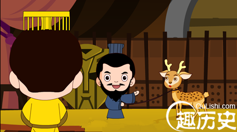 一天上朝时,赵高让人牵来一只鹿,满脸堆笑地对秦二世说:“陛下,我献给您一匹好马。”秦二世一看,心想:这哪里是马,这分明是一只鹿嘛!便笑着对赵高说:“丞相搞错了,这里一只鹿,你怎么说是马呢?”赵高面不改色心不跳地说:“请陛下看清楚,这的确是一匹千里马。”秦二世又看了看那只鹿,将信将疑地说:“马的头上怎么会长角呢?”赵高一转身,用手指着众大臣,大声说:“陛下如果不信我的话,可以问问众位大臣。”