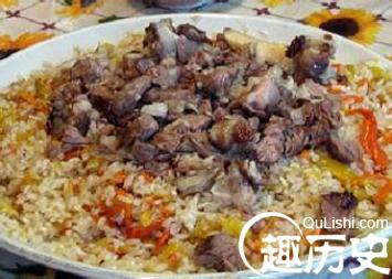 抓饭、是维吾尔族招待客人的美味食品。它用大米、羊肉、清油、洋葱、胡萝卜蒸煮而成,白里透黄,油亮喷香、硬软适度,戚甜味美。