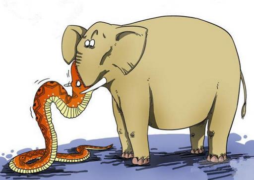 “丞相被蛇一口吞下了”,此消息一出,很快便传遍了全国。此后“人心不足蛇吞相”便越传越广,越传越神,时间久了之后,人们想:“一条小小的蛇如果能吞下一头大象,不是更能反映出人心的贪得无厌吗?”于是“人心不足蛇吞相”便渐渐被“人心不足蛇吞象”所代替,以致今日太多人记住了,形容人心太贪用“蛇吞象”;而忘记了“蛇其实是吞掉了贪得无厌的丞相”这个故事原型。