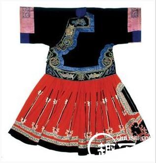 过去贫穷人家贴1—3条异色布条,中等人家镶花边,殷实人家还在异色布条上绣花。裙以底色为素白色,以细黑布条勾棱成8幅,即八副罗裙,下摆与大平幅中下部贴稍宽黑布条。每幅下大上小用数纱工艺绣3组花,前后对称,左右匀衡。整件裙黑白相间,棱角分明,主题突出,庄重朴实,工艺精湛。妇女下裳后以裤取代裙。裤短而大,喜在裤脚边缀三条异色边或梅花条,讲究的以十字挑花来美化裤脚。