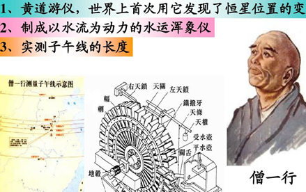 一行在天文方面也作出了重大贡献,他通过长期的天文观测发现了恒星移动的现象,进一步发现和认识了日,月、星辰的运动规律,废弃了沿用长达八百多年的二十八宿距度数据,并在历史上第一次提出了月亮比太阳离地球近的科学论点。