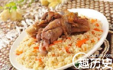 新疆手抓饭俗称抓饭。相传一千多年前,有个叫阿布艾里。依比西纳医生晚年时候身体虚弱,吃了很多药都无济于事,他研究了一种饭进行食疗。他选用了羊肉、胡萝卜、洋葱、清油、羊油和大米加水盐后小火焖熟。这就是维吾尔族人普遍吃的抓饭了。