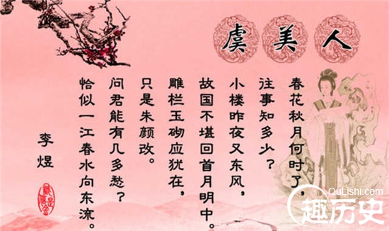 虞美人原是唐朝教坊名曲,赞美的是项羽的宠妃虞姬。后来因为李煜的这首虞美人,这个词牌便变的无人不知了。虞姬为挽救项羽的败局,自刎于爱人怀中,可是最终也无力回天,楚霸王还是魂归乌江了。一直以来我都觉得虞美人并不是什么好的词牌,因为太多的爱恨情仇居于此,也正如同后主,一首思乡的《虞美人》,竟也成了自己的催命符。不知道当他饮下宋太宗送来的鸠酒时,有没有一丝后悔自己的这首亡命佳作呢?