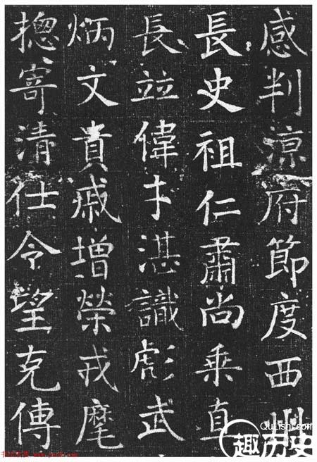“点画稍细,恐不堪经久”道出了颜真卿对铭石之书在使用传播中的见解和务实的作风,擘窠大书也就由此而诞生了。以篆隶厚重之笔,变初唐瘦硬研美的楷法;又取篆籀体势,外密内疏。这一规模,早在四十六岁时所作的《东方朔画赞》中已初具端倪。研美秀丽的书体对书卷之作果然合适,但对于端庄正严的碑来讲未必协调,所谓内涵制约形式。另一方面,颜真卿将行草书中参入篆籀笔意的成功经验合理地融于楷书中,加重了笔画的厚重感,长者使短,短者使长,最大程度地利用每格空间,宽博雄浑,大气磅礴,具有体积感的暗示性。以拙为美,以朴为华,既增添了碑的感染力,又是其人格得到自然的显现,表现出强烈的存在感。即便在他的行草书中,也表现出这种特点,这是同羲之书法的最大差别之一。
