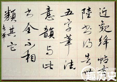 一拓直下,王羲之行笔的一大特点,即起笔调峰下按后,由慢到快地向一端劲健地行笔,意如滑梯,利用冲力和摩擦力,达到力透纸被的目的,尤其在纵向笔画中,更为明显/这种行笔的最大好处,容易使点画挺健秀丽,尤其对写较小的字或是用较硬的笔来讲,效果甚佳。从羲之流传下来的作品看,大都是布局较小的简札之类,采用这种形式,既是自然而然的,也是合适的。其中表现较为典型的,如《丧乱帖》、《何如·奉橘贴》、《二谢帖》等。颜真卿则采用与羲之甚为不同的方式,自名为“屋漏痕”,就像房内浸水,一缕水在墙上由上而下地淌下。虽运动状是直的,但水痕因墙面上的凹凸与阻力的不同,速度和形态均会发生微妙的变化,甚似一缕藤丝,以柔见劲。行笔时,笔毫微微振动,亦入射行,腹部上每一鳞片都会在行走时微微起伏,作用于地面。这一方面也许同颜真卿早期贫困、下雨时屋内景厂浸水有关;另一方面由于他喜作大字有关。当笔较小,按得又重,笔毫容易散败,如稍加提按振动,易使笔毫齐顺复原。这种方法,在金文和汉隶中是常见的,在楷、行中,鲁公为最典型,如传他的《蔡明远贴》,这对以后羊毫笔的普及使用,开辟了一条最为广阔的天地。