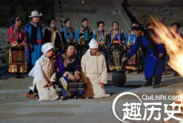 接着,端公、盔甲、吊丧亲戚和孝男孝女鱼贯而至大门。此时门口陈设敬神的玉米两升(装在一小斗内)、一个刀头、八杯酒,玉米中插香蜡。端公持短剑念咒,表示驱邪,替亡人禳解。八个盔甲手执三叉纸花在门口用羌话赞唱(不跳),赞扬死者生前待人接物如何好,勤劳理家,省吃俭用,把子孙抚养成人,责备把门将军(门神)失职,家中人口减少,他全然不管事,盔甲唱毕,孝子敬在场的所有成年人每人一杯酒,表示以神饮剩的酒敬亲戚邻里。门口的活动约半小时。